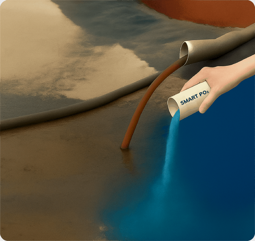 Unlike conventional aeration-based or ozone-based oxidation systems, SMART PO₂ doesn’t just break down pollutants into smaller intermediates — it completely mineralizes them. It operates without aeration, consumes no external energy for oxygen supply, and produces no sludge or secondary waste.
